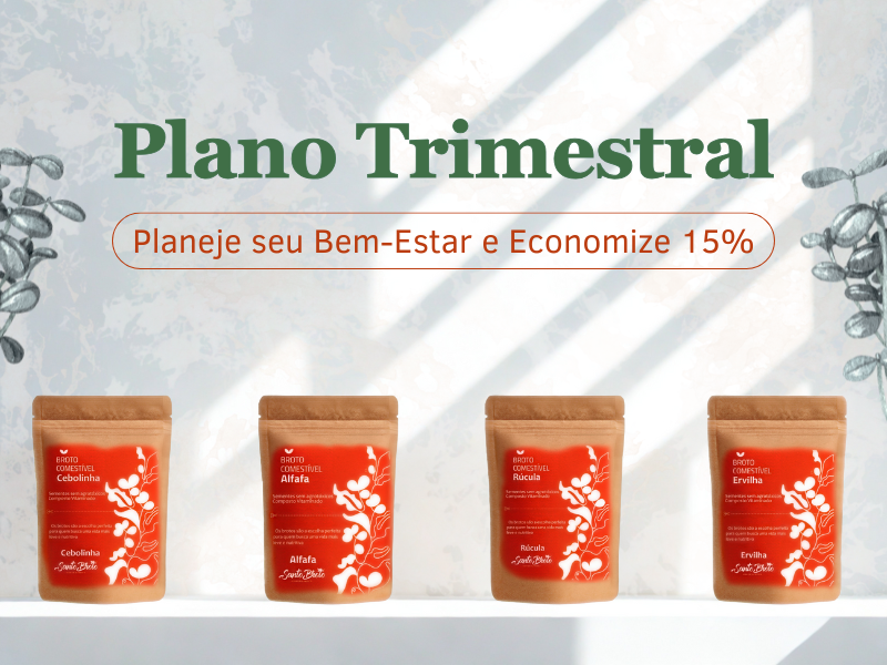 Receba por mês 4 kits de cultivo de brotos, com 4 variedades de sementes, composto vegano e acesso a receitas exclusivas. Este plano oferece uma condição especial com 15% de economia sobre o valor total, sendo a forma mais vantajosa de manter sua rotina de bem-estar com praticidade e sabor.