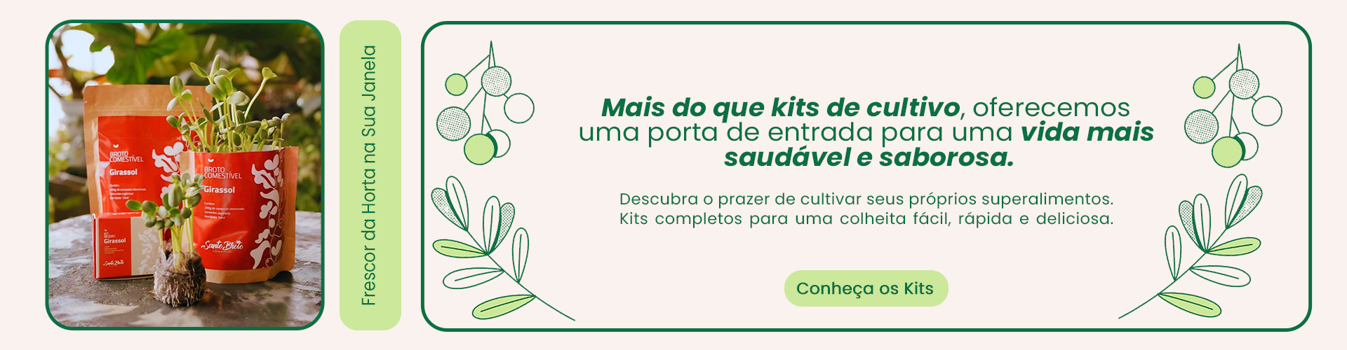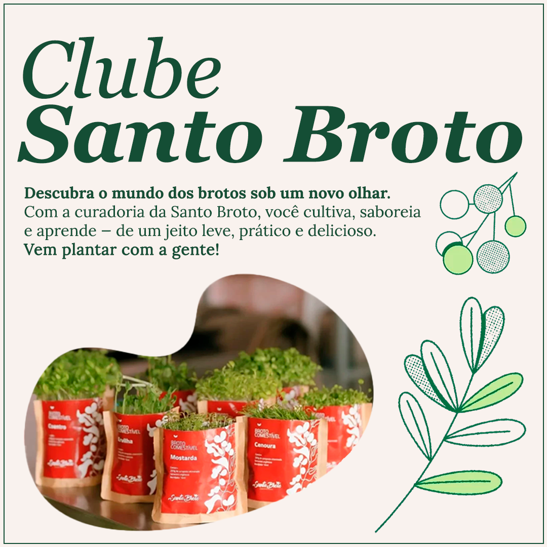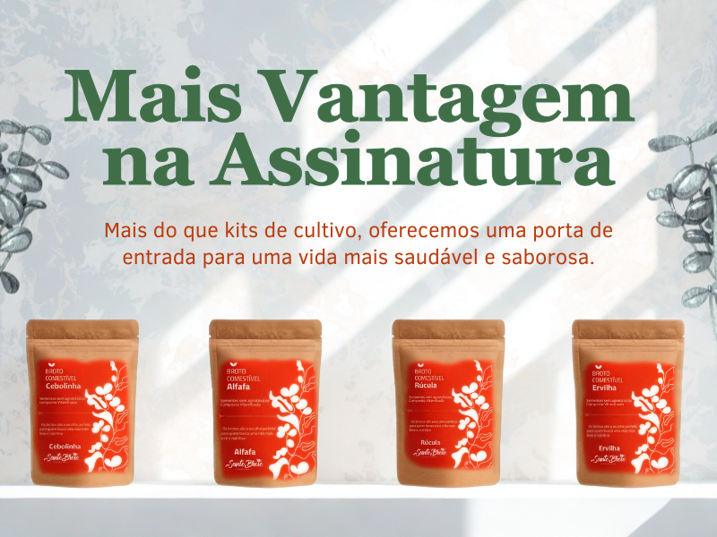 Receba por mês: 4 kits de cultivo de brotos, com 4 variedades de sementes, composto vegano e acesso a receitas exclusivas.